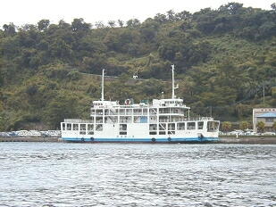 対岸の桜島へ到着。このフェリーは鹿児島−桜島間を頻繁に往来する事が出来る様、前後の 形状が対称になっています。 桜島についた筆者は、今日の宿である「桜島ユースホステル」へ。地下に温泉があるという珍