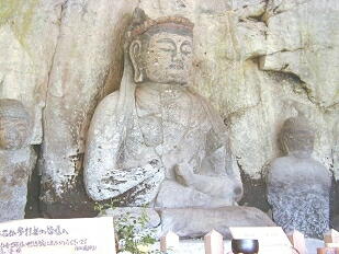 史跡が多く残る北川町をパス。さらに宇目町から大分県に入ります。雨のほうは強く降ったり 弱くなったりと一進一退の状況。やがて野津町よりR502に入り臼杵市へ。そして山肌に刻まれ た約60体の石仏が並ぶ「臼杵石仏」を見学。端正な顔立ちの大日如来。張り詰めていた神経 が、フッと和む瞬間です。