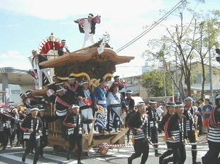 に入ります。その後、阪和自動車道、堺泉北道路、R26と走りつないで岸和田へ。そう、この日 はあの過激さで知られる「岸和田だんじり祭り」が開催されるのであります!筆者が会場に到 着したのはまだAM9:00頃でしたがもう辺りは祭りの熱気ムンムン。勢い良く綱を引っ張る若 い衆!だんじりの上で踊り狂う大工方!祭りの熱気は早くも最高潮だ!それに加えてこの厳し い残暑。見ているコッチが参ってしまいそうでした。