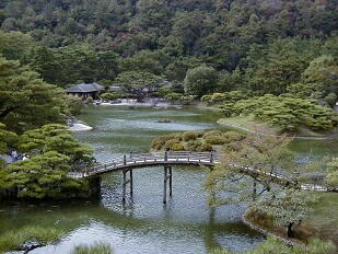 ところが栗林(りつりん)公園。かつては高松藩主・松平家の大名庭園だったところです。75万 uを誇る広大な敷地内に、紫雲山を背景とした池や築山の見事なまでの配置。あの日本三名 園までもが霞んでしまうほどでした。