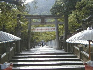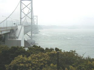 ます。ところが、大鳴門橋はあまりの強風のため、最高速が40km/hに規制に。ちょっとでもバ ランスを崩せば、数十m下の海へまっ逆サマ!バイクに乗っていてこれほど怖いと思ったこと はありませんでした。鳴門北ICまでの、わずか数kmの区間がどれほど長く感じられたこと か・・・。高速を降りる頃には必死でハンドルにしがみついていた両方の二の腕が、すっかり筋 肉痛になってしまいました。 ほうほうの体で徳島県の鳴門に渡り、気を取り直して鳴門公園へ。つい先程、必死の思いで