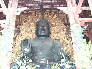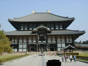 創建された寺院です。南大門に造られた、金剛力士像(鎌倉時代:運慶・快慶の作)の出迎え を受けます。さらに木造建築物としては、世界最大の大きさを誇る大仏殿(高さ47m!)に圧倒 されました。大きい…。早速大仏殿内に入り、かの有名な大仏様とご対面。柔和な顔立ちが印 象的でした。また、ここ大仏殿には、あの「柱くぐり」の穴あき柱がある事でも知られています。 大仏殿からは、ここから程近い正倉院へ。独特の校倉(あぜくら)造で有名な高床式の倉庫を