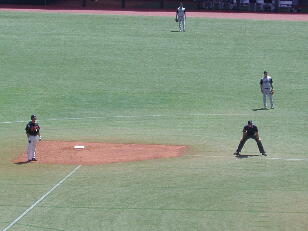 三塁塁審が二塁を兼務しています。もちろん左翼・右翼に線審はいません。
