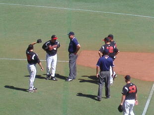た、驚いたことに試合は3名のアンパイアによって裁かれていました。局面に応じて一塁塁審と